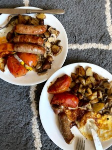 Yesterday was St. Patrick’s Day. Originally, it was to be the centerpiece of our vacation in Ireland: Our first full day there, marching in the Dublin parade with the bagpipe band, taking in the spectacle. Instead, of course, Tess and I stayed home, but we did our best to keep the spirit alive. We started with our best recreation of a Full Irish breakfast: Sausages (Trader Joe’s brand; not a single Irish-sourced menu item, not even the butter), tomatoes (fried rather than grilled), mushrooms, eggs (not too runny), and some potatoes with a bit of ketchup. No black or white pudding (remember, we had no time to track down Irish imports in the midst of last week’s run on grocery stores. I think I had a tea.